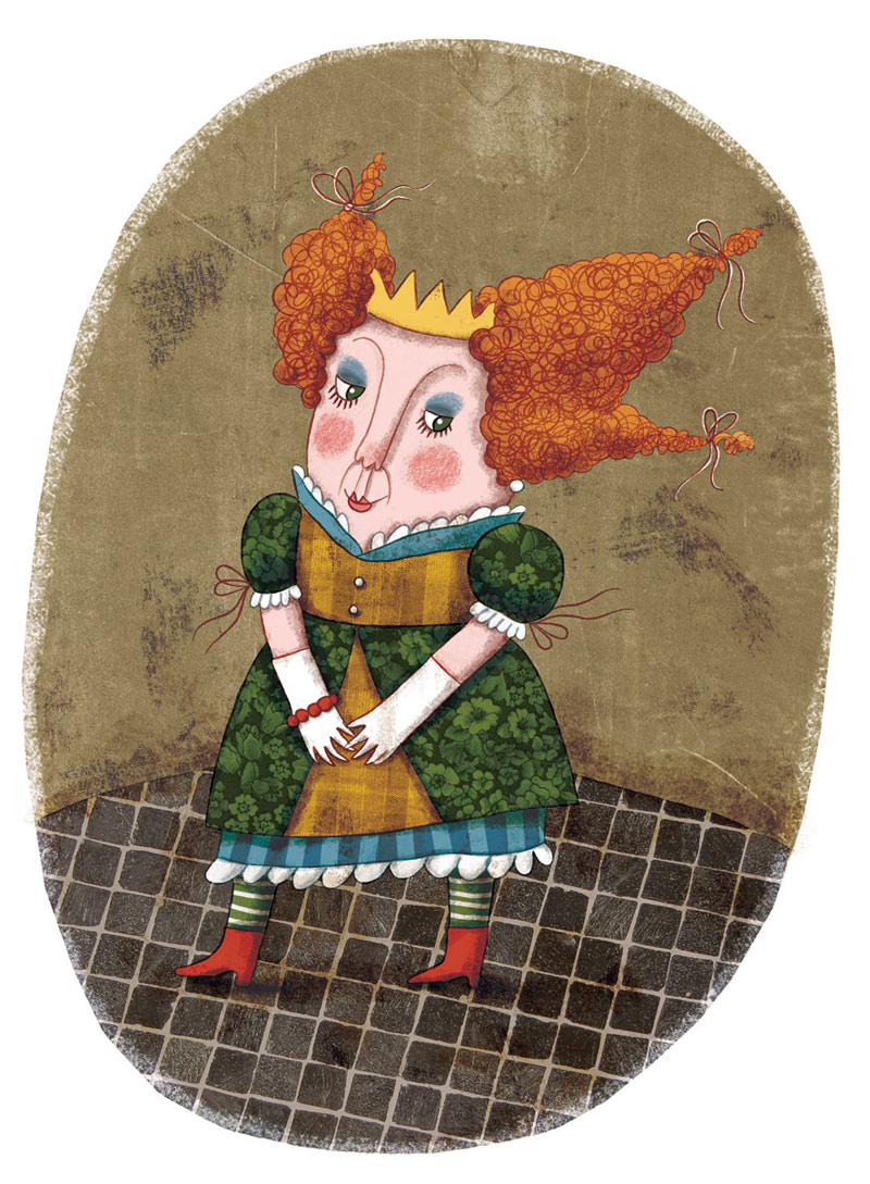 Ovih dana radim na osmišljavanju likova za jednu slikovnicu. U pitanju je prilično šašava priča, takoreći bajka, sa gomilom živopisnih karaktera...Ali pošto ne bih smela puno da otkrivam, evo za sada samo dve od završenih ilustracija. Na prvoj su prikazane dvorske dame (ova ilustracija je ujedno i moj odgovor na ovonedeljnu Illustration Friday temu), a na drugoj je glavna junakinja, kraljica lično!