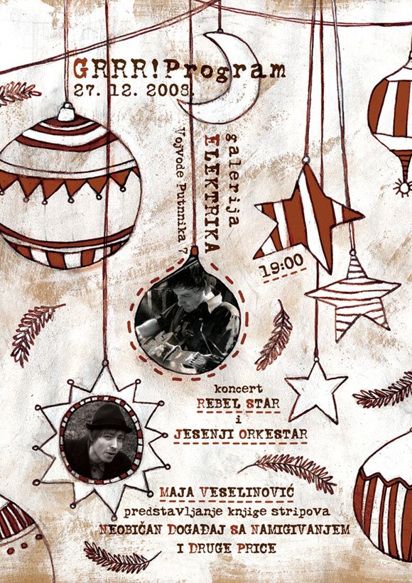 Inače, za ovu prednovogodišnju zgodu imala sam zadovoljstvo da napravim plakat (ovaj sa ukrasima). A na fotografijama koje slede primetićete, između ostalog, i dva "ljupka" stvora od kartona. Njih sam osmislila, nacrtala i iseckala specijalno za ovu priliku :-)