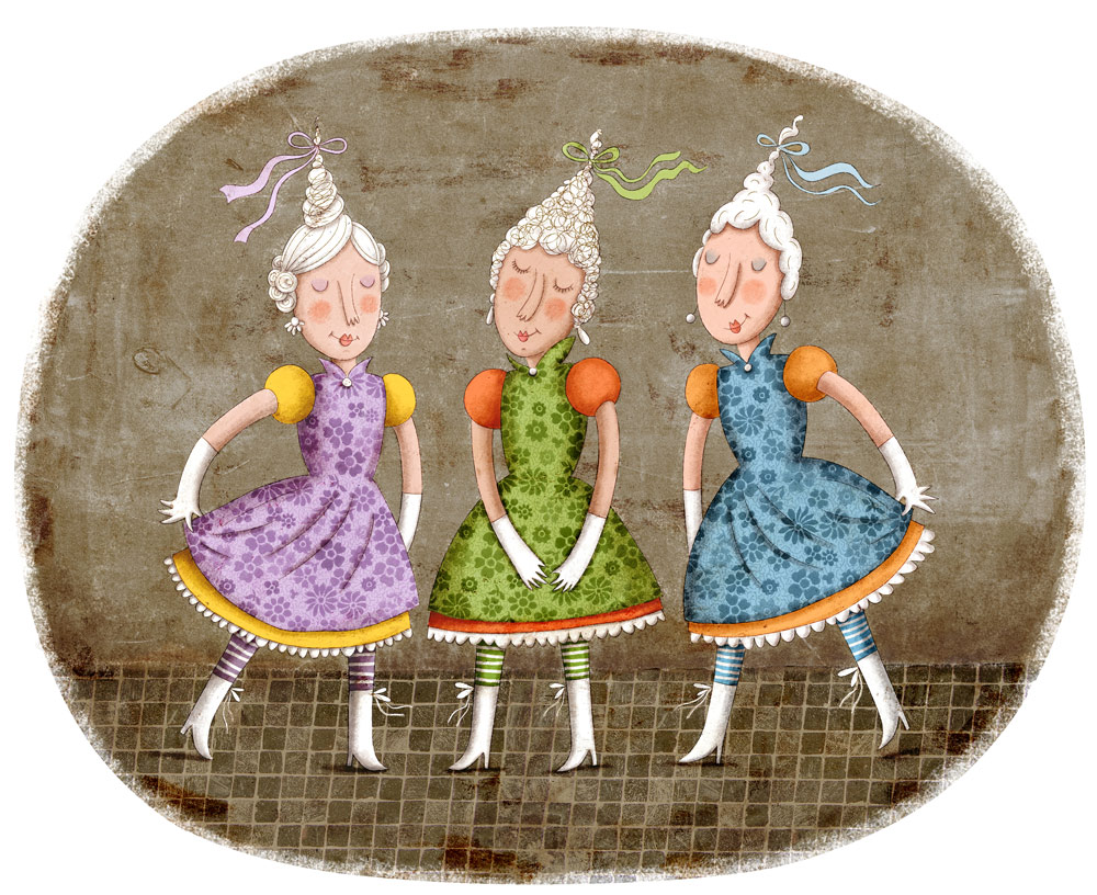 These days I've been busy with creating some characters for a picture book. It's a quite an unusual story, almost a fairy tale, with a bunch of picturesque creatures...But, since I can't reveal more, here are just two of finished illustrations. On the first one the three lovely court ladies are shown. This illustration is also my entry for this week's Illustration Friday. And on the second one you can see the main heroine of the story, the queen herself!