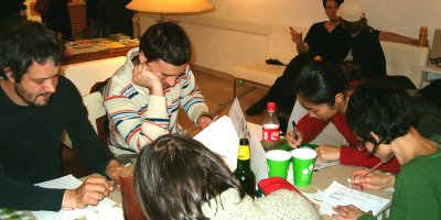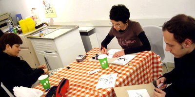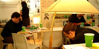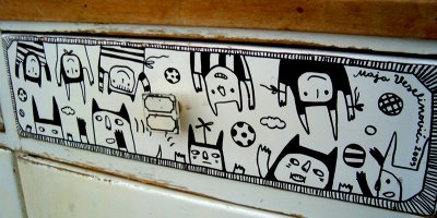 Što se fotki tiče, ovo je samo delić. Ostatak pogledajte ovde. A evo i najnovijeg Zografovog stripa sa utiscima iz Linca. Uživajte! It took me ten days to gather my thoughts and sort the photos from the first Next Comic festival, which was held from March 6 to March 8 in Linz (Austria). It was a great experience, useful and refreshing in every way. By that I don't mean just the comics festival, which, as expected, was very well organized and well visited. The whole impression that the city left on me was refreshing - the people, the atmosphere on the streets... Linz itself is not a big city, but it is tidy and lively, just like a nice chocolate box or some nicely arranged domestic kitchen closet :-) In addition, it was made the European Capital of Culture 2009! More about that here.And during the festival itself there was the opening, the award ceremony, discussions, lectures... and, of course, comics. Those hung on the gallery walls and those on sale. I liked both. But what impressed me the most was the workshop organized by our great hosts from the Unkraut comics collective! Inspired by our gathering in Pancevo last year, on the Kitchen Workshop (Elektrika gallery, October 2008), and by the concept of drawing in the kitchen ambiance, they brought a real old-time kitchen to the gallery! All the elements were there: the kitchen sink, floor mops, checkered table cloths, tea, food... Add to that the exhibitions of Alexandar Zograf's comics and incredible embroidery of Gordana Basta, which were set up in the same space, and the mood was just right. We could not resist drawing, first on paper and then all over the kitchen furniture :-) I was very honored to get the chance to draw over two whole drawers! And Vlada Palibrk drew one, while Zograf, together with Henrik Dorgathen did the whole closet door! And the best thing about drawing on the furniture it that these "comicized" kitchen parts will be sold on an auction, with all profit going to charity.There were a lot more interesting details I could write about, but I feel this post is already too long. At the end, let me just mention the KAPU club, the place where we slept. KAPU is well known by concerts that many famous bands held there at their beginnings, like Nirvana who played in Linz twenty years ago. There is a video from that concert. Allegedly, Curt Cobain signed his name on one of the walls... I drew couple of sketches on the walls myself :-) Thanks a lot to friends from Unkraut - Christian, Martin, Janina, Mika, Willie..., people from KAPU, and the director of the festival Gottfrid Gusenbauer.