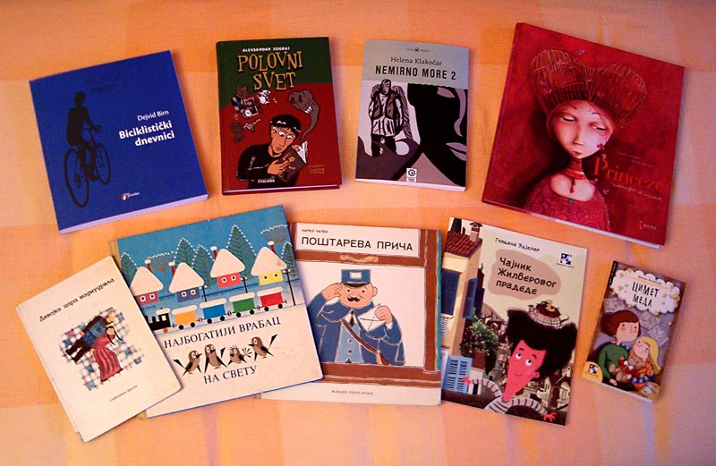 I ove godine sam sa Sajma knjiga donela pretežno knjige sa slikama! Neke sam kupila zato što sam planirala, neke sam sticajem čudnih okolnosti dobila, jednu sam čak i ilustrovala :-) A ove tri dole levo skoro da su mi same uletele u ceger! Do neba sam se obradovala ugledavši ih na jednom od štandova sa starim knjigama. U pitanju su slikovnice: Devojka cara nadmudrila - sa predivnim ilustracjama Ide Ćirić, zatim Najbogatiji vrabac na svetu - sa ilustracijama legendarnog češkog ilustratora i animatora Zdeneka Milera i Poštareva priča - koju je po tekstu Karela Čapeka nacrtao njegov brat, slikar Josef Čapek. Sve tri knjige kod nas su izdate sredinom šezdesetih, a sudeći po posvetama, pripadale su devojčici po imenu Violeta koja ih je dobila za uspeh i primerno vladanje. Da sam imala malo više vremena za obilazak, ko zna kakva blaga bih još otkrila na svim tim prašnjavim, zabačenim štandovima...